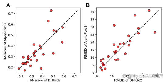 更值得一提的是,尽管 DRfold2 和 AlphaFold3 展现出相似的整体性能,但下图中的结果突显了两者之间的强大互补性,特别是在预测显著偏离对角线的情况下——通过将 AlphaFold3 的预测作为额外的势能函数项纳入 DRfold2 优化框架,研究人员在 TM-分数 和 RMSD 上都取得了统计学上显著的提升。
