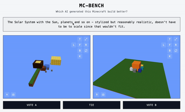 Minecraft Benchmark(或 MC-Bench)像一个竞技场,在一对一的挑战中针对相同提示生成Minecraft作品。