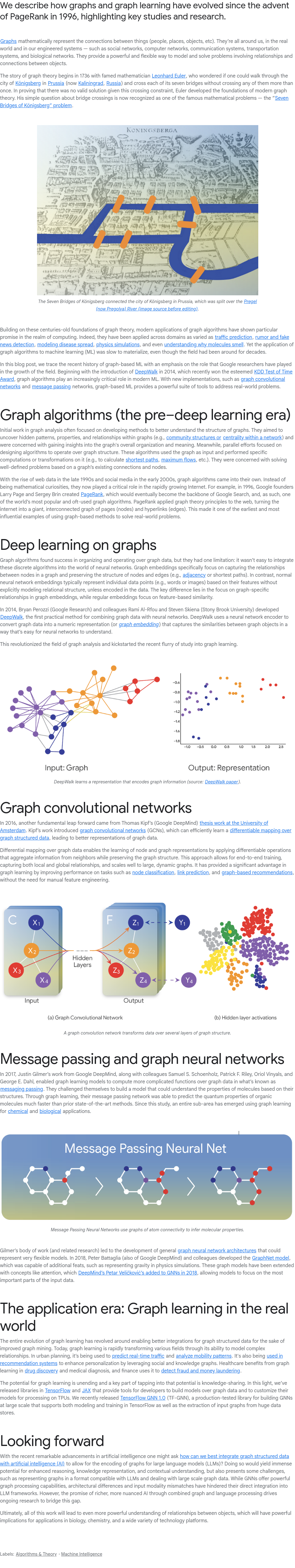 Graphs and graph learning have significantly evolved since the introduction of PageRank in 1996. Graphs mathematically model connections between entities like people, places, or objects, applicable to social networks, computer systems, transportation, and biological networks. They offer a flexible framework for solving problems involving relationships. The origins of graph theory trace back to 1736 when Leonhard Euler addressed the Königsberg bridge problem, proving it impossible to cross each of its seven bridges only once. This laid the foundation for modern graph theory. Key studies and research have since expanded on this foundation, leveraging graphs to analyze complex systems and develop advanced algorithms like PageRank, which revolutionized web search. Graph learning continues to advance, enabling powerful applications in machine learning, network analysis, and beyond.