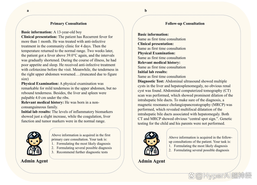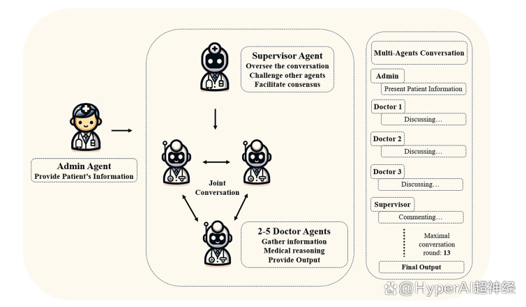 研究团队利用 Autogen 提供的结构,分别基于 GPT-3.5-turbo 和 GPT-4 开发了 2 个多智能体对话框架 (Multi-Agent Conversation Framework, MAC),模拟医生会诊。如下图所示,其中 Admin Agent 提供患者信息,Supervisor Agent 负责发起并监督联合对话,3 名 Doctor Agents 共同讨论患者病情。对话将持续进行,直至 Agent 间达成一致意见或达到预设的最大对话轮次(本研究设定为 13 轮),输出最终诊断结果。