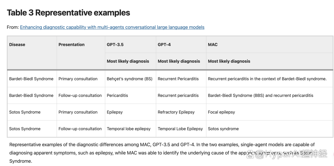 在特定案例的病症诊断中,如下图所示,研究人员发现 GPT-3.5 和 GPT-4 能够基于明显症状诊断疾病,例如通过临床表现识别心包炎和癫痫,然而,它们在探究疾病的根本原因方面存在不足。相比之下,MAC 框架通过联合对话进行更深入的分析,可以确定特定病例的心包炎是由 Bardet-Biedl 综合征引起的。