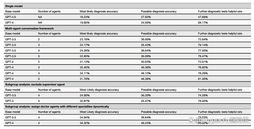 使用来自 Medline 数据库的真实临床病例报告,研究人员评估了 GPT-3.5、GPT-4 和 MAC 对 302 种罕见疾病的知识和诊断能力。此外,其还研究了不同设置对 MAC 性能的影响。