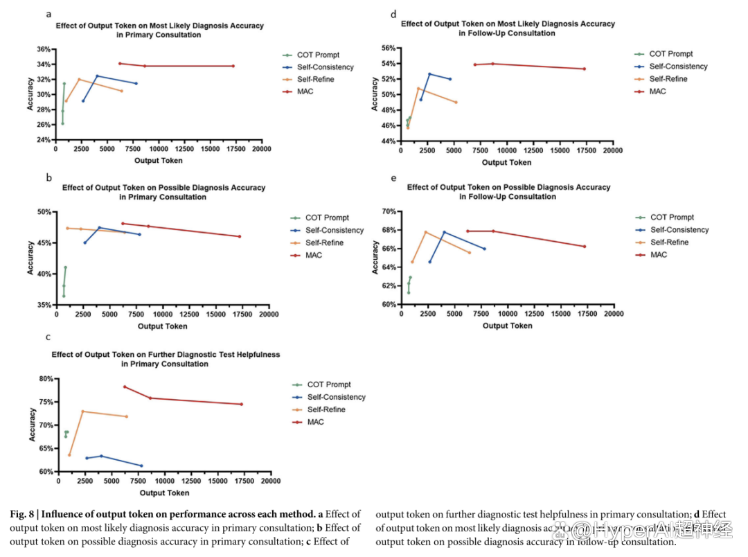此外,MAC 输出的 tokens 也更多,增加的输出不仅有助于探索不同的推理路径,还使反思与修正先前输出成为可能,这可以增加分析深度,提升识别被忽视疾病根本原因的能力。然而,研究亦表明,尽管增加 LLM 调用的数量并由此生成更多 tokens 可以提升 MAC 性能,但这种改进幅度受到任务类型及所采用细化方法的限制。