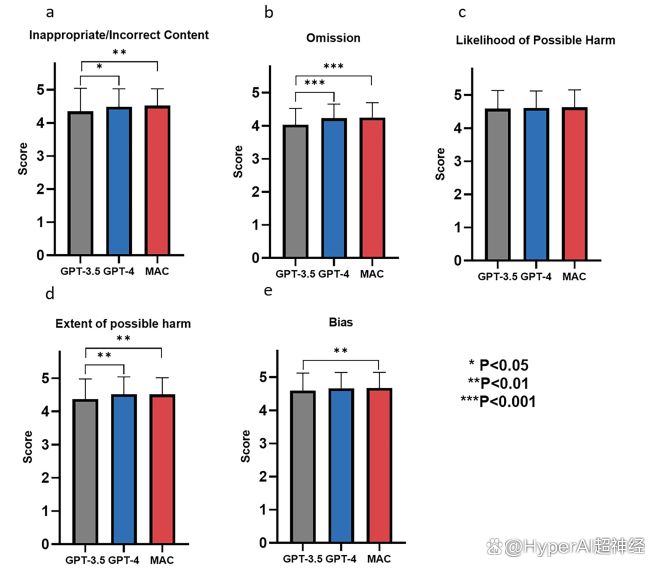 研究团队评估了 GPT-3.5、GPT-4 和 MAC 框架在罕见病知识生成方面的表现,包括疾病定义、流行病学、临床特征、病因、诊断方法、鉴别诊断、产前诊断、遗传咨询、治疗管理及预后等内容。结果表明,如下图所示,这些模型在所有评估维度上表现良好,各项指标得分均超过 4 分。此外,它们在内容准确性(不适当/不正确的内容)、信息完整性(遗漏)、安全性(可能伤害的可能性及程度)以及客观性(偏倚)等方面均展现了较高的水平。