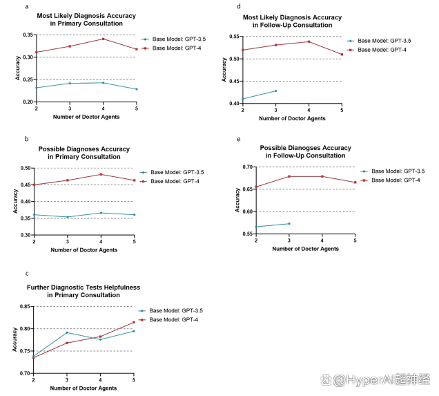 进一步地,在模拟 4 名 Doctor Agents 参与的初步咨询场景中,基于 GPT-4 的 MAC 框架在多项关键指标上均取得了更优异的表现:在最可能诊断的准确性方面达到 34.11%(GPT-3.5 为 24.28%),在可能诊断的准确性达到 48.12%(GPT-3.5 为 36.64%),在进一步诊断测试的帮助度方面达到 78.26%(GPT-3.5 为 77.37%)。在随访咨询中的诊断表现, 具有 4 名 Doctor Agents 参与、基于 GPT-4 的 MAC 框架也表现最优。