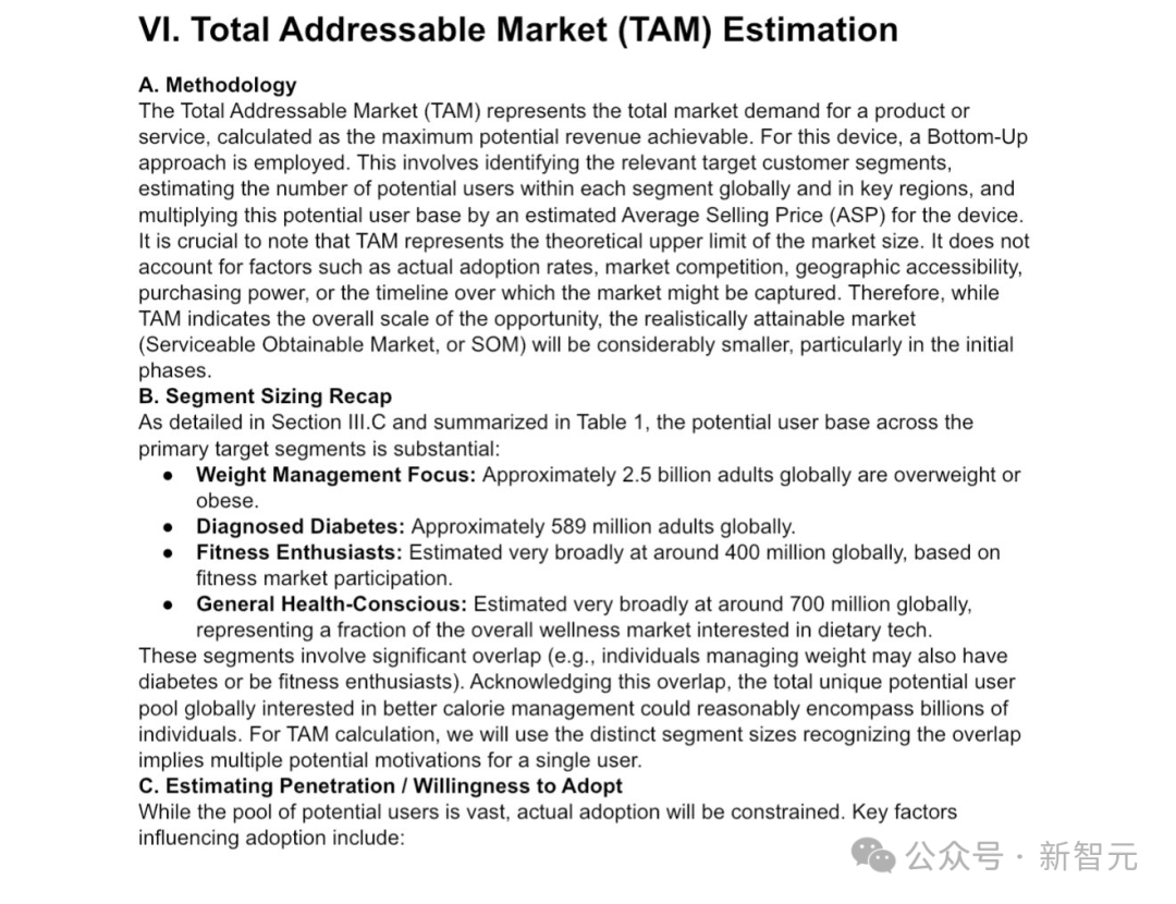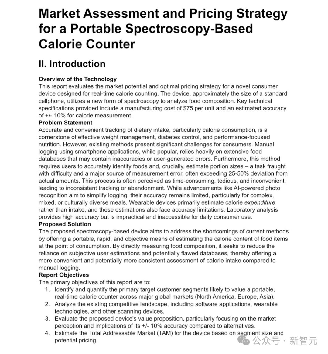 沃顿商学院教授Ethan Mollick将课堂一项作业扔给谷歌DR——为一种采用新型光谱技术、成本75美元的食物热量检测设备进行定价及总体可获取市场(TAM)分析。
