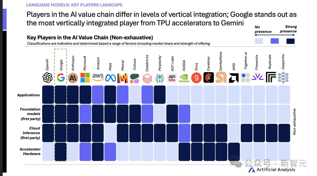 几天前,Artificial Analysis一份报告中,展示了谷歌在应用、基础模型、云服务、加速器硬件四大关键领域全面开花。