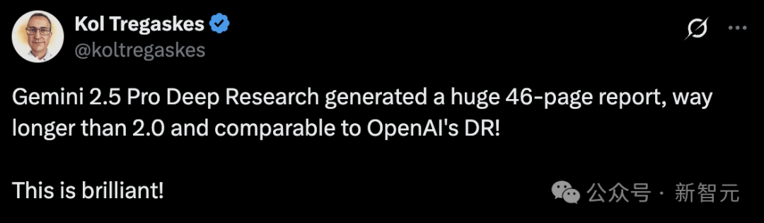 他表示,这次改进比Gemini 2.0版本加持DR报告长度更多,而且与OpenAI DR相当。这从侧面印证了,谷歌基准测试中,DR的完整性是最强的。
