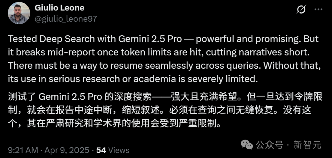 他表示,虽然Gemini 2.5 Pro加持的DR非常强大,但一旦达到token数量限制,报告就会中断。