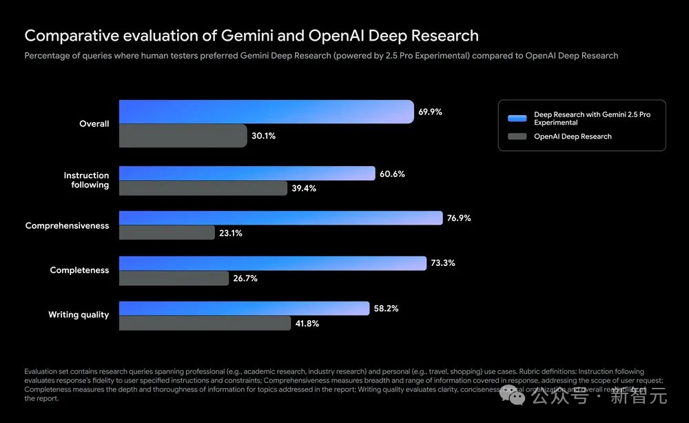 相较于OpenAI DR,谷歌在整体性能上飙升超40%。此外,在指令遵循、全面性、完整性、写作质量方面,谷歌Deep Research性能跃升很大。