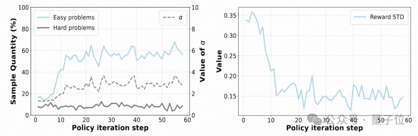 △图 1(左)在一个组中,所有奖励都是0的简单问题的比例和所有奖励都是1的困难问题的比例。(右)奖励在各步骤间的标准差。