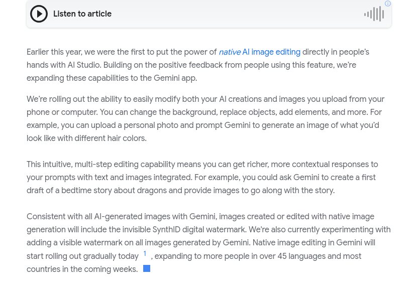 今年早些时候,我们通过AI Studio首次将原生AI图像编辑功能直接交到用户手中。基于用户的积极反馈,我们现在将这些功能扩展到Gemini应用中。新功能允许用户轻松修改AI生成的作品或从手机、电脑上传的图片,包括更改背景、替换物体、添加元素等。例如,用户可以上传个人照片并要求Gemini生成不同发色的效果图。这种多步骤编辑功能使用户能获得更丰富、上下文更相关的文本和图像回应。比如,用户可以让Gemini创作一个关于龙的睡前故事初稿,并生成配套插图。与Gemini生成的所有AI图像一致,使用原生图像生成创建或编辑的图像将包含不可见的Synth标志以标识其为AI生成内容。