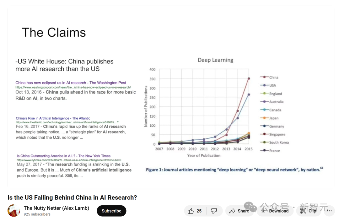 「目前中国机构在文章和会议上发表的AI研究只占5%到15%,而产出比美国机构少得多。」