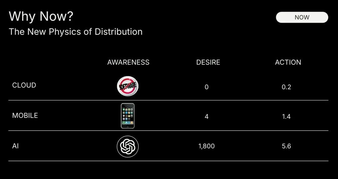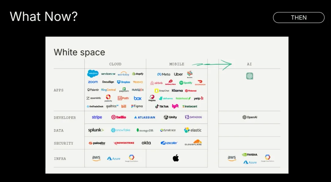 在之前的技术转型中,大多数这样的公司都处于行业顶端,大多集中在应用层。我们一直认为,并且现在依然坚信,AI 领域也是如此,价值就存在于应用层。但你猜怎么着?竞争也很激烈。