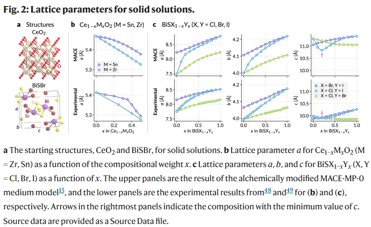 为验证炼金图在固溶体建模中的能力,研究人员以晶格参数为测试指标,评估其是否符合Vegard定律或存在偏离。在Ce₁₋ₓMₓO₂(M=Zr, Sn)体系中,炼金模型成功再现了Zr体系中的线性变化以及Sn体系中出现的正偏离。类似地,BiSCl₁₋ₓIₓ体系中的晶格常数a和c表现出与实验一致的非线性趋势,特别是c参数的极小值位置预测准确,尽管绝对值存在偏差。