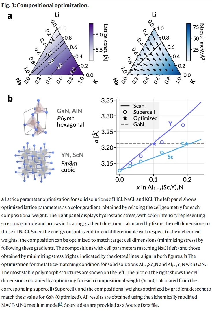 利用炼金权重的可微性,研究人员进一步开展了组分优化实验。首先在LiCl-NaCl-KCl混合体系中,通过对应力的导数进行梯度下降,可有效寻找使晶格常数匹配目标值的最优组分组合。在更复杂的体系如Al₁₋ₓScₓN和Al₁₋ₓYₓN中,通过调节炼金组分及晶胞参数,实现与GaN匹配的应力最小化组分,所得结果与扫描法和实际掺杂模型高度一致,表明炼金方法可作为具有代表性的紧凑建模手段。