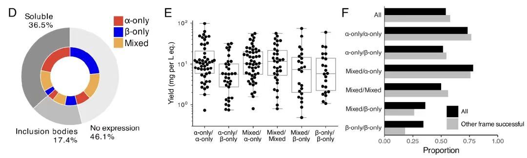 此外,如下图 D-F 所示,成功率因蛋白质的二级结构含量而异,其中 α 螺旋蛋白的成功率最高。此外,31% 的重叠对成功纯化,且一个框架的成功并不影响另一个框架的成功。这些结果进一步支持了 OLG 序列的高可行性和实验验证率,证明了该算法在设计功能性和结构稳定重叠蛋白方面的有效性。