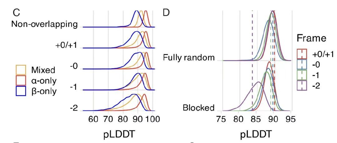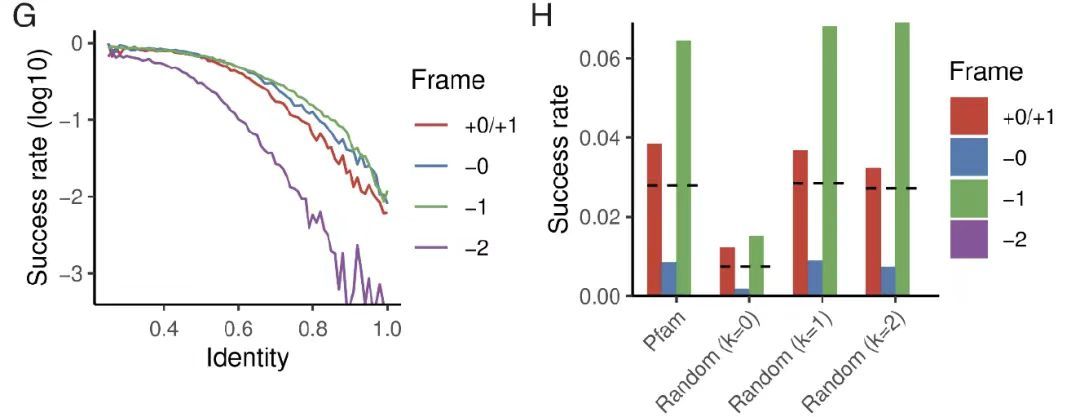 在进化可及性研究中,研究团队以固定突变数量的种子蛋白序列为起始。如下图 G-F 所示,研究发现即便在零突变的极端条件下,仍有约 1% 的设计能达到高结构稳定性(pLDDT>85,TM>0.7);以天然 Pfam 序列作为亲本时,成功率提升至 3%,且该结果与保留一阶组成偏差的随机序列一致。这充分表明,高度优化的天然蛋白无需大幅序列改变,即可在替代框架中容纳新蛋白,验证了 OLG 在进化层面的可行性。