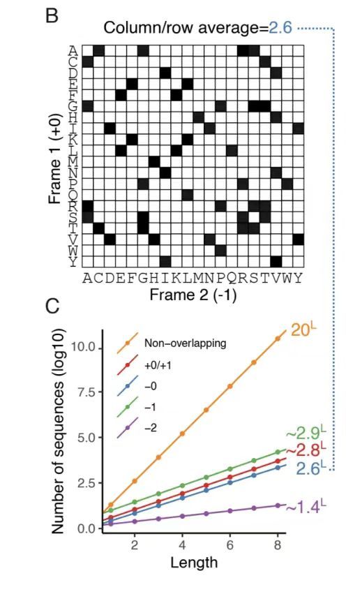 如下图 B 所示,通过分析 -0 框架的氨基酸兼容性矩阵发现,参考框架中单个位置平均存在 2.6 种兼容氨基酸选择,形成 52ⁿ(n 为序列长度)种潜在重叠序列对,凸显遗传密码简并性带来的设计空间。借助蒙特卡洛近似(Monte Carlo approximation)量化其他框架自由度(degrees of freedom),如下图 C 所示,结果显示 +1 和 -1 框架自由度较高(分别约 2.8 和 2.9),而 -2 框架因密码子简并性利用效率低,自由度显著受限(约 1.4)。