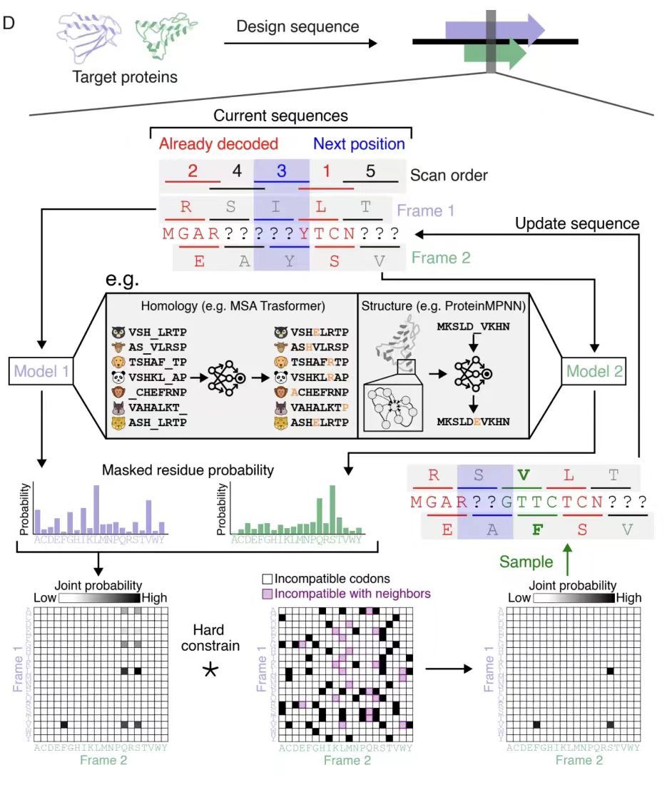 最终,如下图 D 所示,算法通过系统扫描序列位置(Scan order),在每次扫描中结合相邻氨基酸约束动态更新联合概率(joint probability)矩阵,经多轮迭代后确保生成的重叠序列对满足框架的兼容性(compatibility)。该策略可扩展至含相位偏移的复杂框架,通过偏置扫描顺序优化设计质量,为生成模型的迭代解码(iterative decoding)提供了关键约束条件。