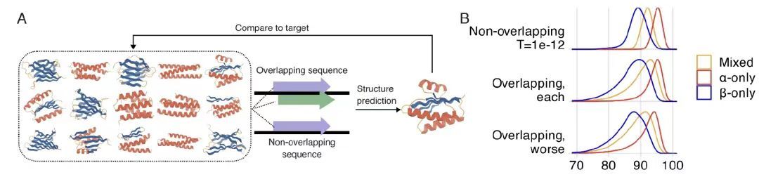 在探究高度有序蛋白质主链结构的重叠可行性时,如下图 A 所示,研究人员利用 ProteinMPNN 结构条件生成模型,针对 15 种从头生成的主链结构(覆盖 α、β 及混合折叠类别),分别生成 56,250 个重叠设计与 33,000 个非重叠设计。如下图 B 所示,AlphaFold2 评估数据显示,重叠设计的平均 pLDDT 值为 90.2,与非重叠设计的 92.0 接近。
