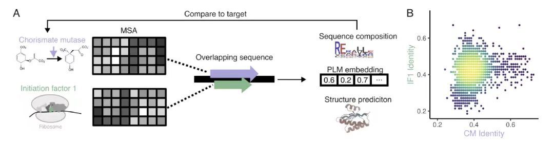 在基于同源性的 OLG 设计评估中,如下图 A 所示,研究团队选取细菌莽草酸突变酶(CM)与翻译起始因子 1(IF1)为目标,借助 EvoDiff-MSA 生成模型,以多序列比对(MSA)作为条件上下文,经逐位置掩蔽与约束采样,生成 3,307 个完全重叠序列(Overlapping sequence)设计。