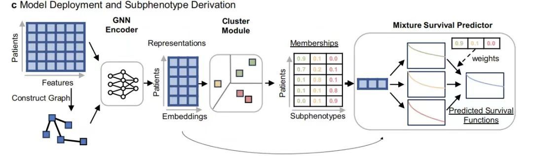 其中,GNN 编码器通过捕捉患者 104 维特征向量(涵盖人口统计学、实验室检查、转移情况等变量)的图结构关系,有效提取高阶患者表征;编码后的表征输入聚类模块,生成具有生存预测价值的亚表型,作为混合模型的基础组件。