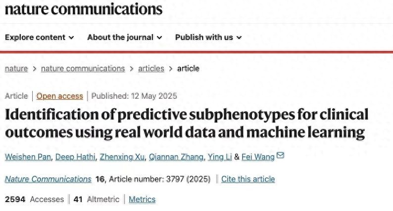 相关研究成果以「Identification of predictive subphenotypes for clinical outcomes using real world data and machine learning」为题,已发表于 Nature Communication。