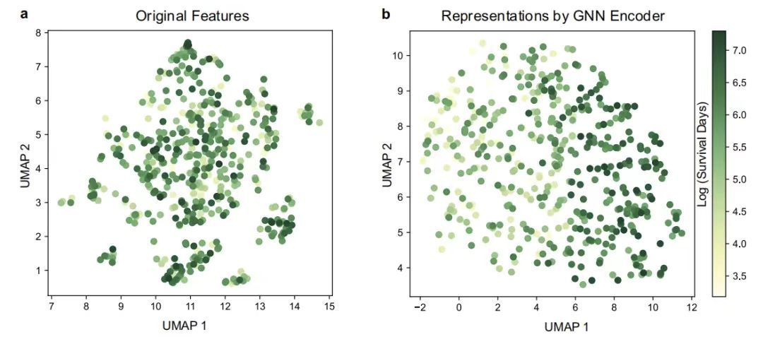 随后,该研究进一步通过可视化患者及其 GNN 编码器衍生的表示来表征 GNN 编码器对 GEMS 的影响,使用的是均匀流形近似和投影(UMAP)。如下图所示,通过均匀流形近似投影(UMAP)可视化发现,GNN 编码器输出的患者表征空间中,不同总生存期时间的患者群体呈现明显分离,而原始特征空间中各类患者混杂分布,直观体现了图神经网络对复杂特征关系的建模能力。