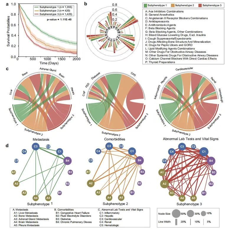 如下图所示,研究人员进一步利用模型识别出 3 个具有显著生存差异的预测性亚表型:亚表型 1(n=1335)以女性比例高(55.50%)、合并症轻、转移负荷低为特征,平均总生存期长达 688 天,止咳药、β 受体阻滞剂等用药率及骨/脑/肾上腺转移发生率均最低;亚表型 2(n=420)生存曲线呈现中期风险升高特征,合并症与转移负荷居中;亚表型 3(n=1420)女性比例 35.21%,平均总生存期仅 321 天,表现为多重用药、高转移率(肝转移 31.20%、骨转移 51.48%)及严重合并症(水电解质紊乱 8.31%、肾脏异常 21.43%),转移-合并症-实验室异常的共发模式最为复杂。