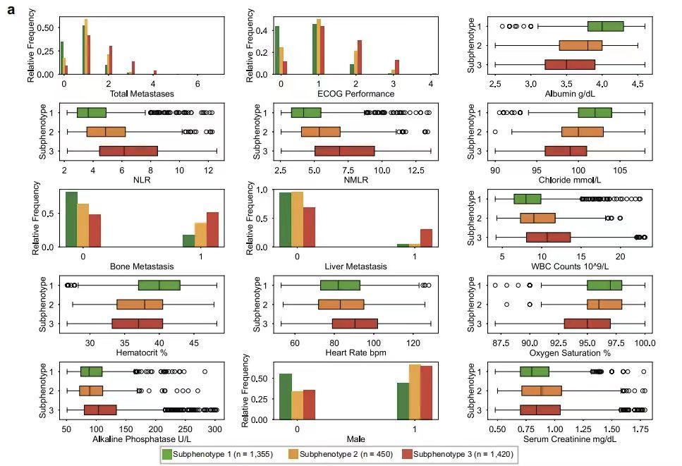 为了进一步了解不同亚表型之间的不同特征,该研究测试了各亚表型之间每个变量的差异。如下图所示,关键预测因子分析显示,东部肿瘤合作组表现状态(ECOG Performance)和总转移部位数(Total Metastases)是区分亚表型的核心指标。实验室指标方面,中性粒细胞与淋巴细胞比率(NLR)、中性粒细胞与单核细胞与淋巴细胞比率(NMLR)是亚表型 2 的特征性参数,而亚表型 1 与正常白蛋白水平(WBC Counts)、高血细胞比容(Hematocrit)相关,亚表型 3 则与心率(Heart Rate bpm)升高、氧饱和度(Oxygen Saturation)降低、碱性磷酸酶(Alkaline Phosphatase)升高等指标密切关联。