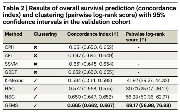 实验结果如下表所示,GEMS 在总生存期预测中表现突出,平均 c-index 达 0.665(95% CI: 0.662-0.667),显著高于最佳基线模型 GBDT 的 0.652;对数秩分数 69.17(95% CI: 58.98-76.98),远超 NSC 的 56.23,验证了监督学习框架对数据特征的有效利用。