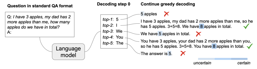 有趣的是,即使不采用显式的零样本提示(zero-shot prompting)或少样本提示(few-shot prompting),也有可能激发出语言模型中的思维链(CoT)推理路径。Wang 与 Zhou 发现,如果在采样的第一个 token 处进行分支,并保留置信度最高的前 k 个 token(其置信度通过 top-1 与 top-2 候选之间的概率差来衡量),然后分别对这 k 条路径采用贪婪解码(greedy decoding)继续生成,那么其中相当一部分生成序列天然包含完整的思维链。