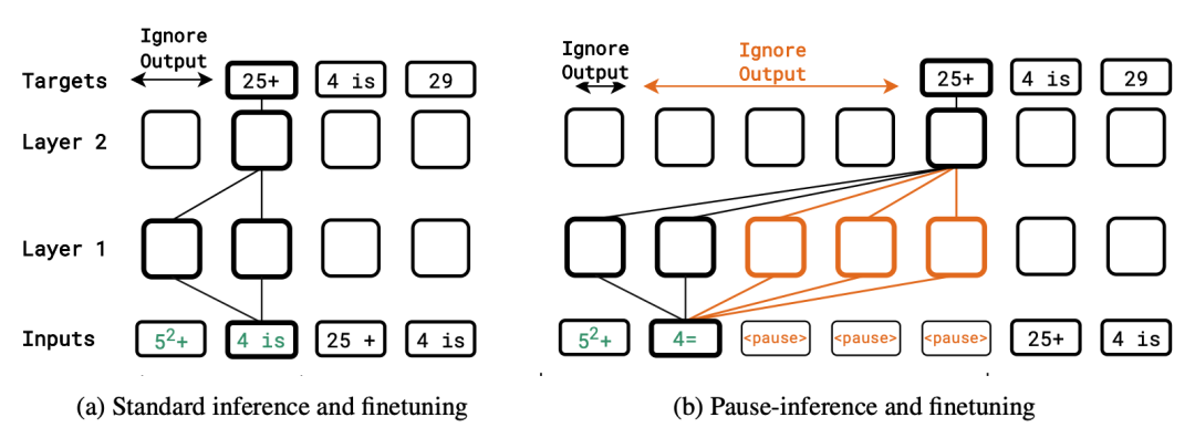 同样,Goyal et al. (2024) 提出的暂停标记通过在输入序列末尾添加虚拟 token(如。或 # 等字符)来延迟模型的输出,从而在推理过程中为模型提供额外的计算量。在训练和推理过程中注入这种暂停 token 都很重要,而只对暂停 token 进行微调只能带来有限的收益。在训练过程中,我们会在均匀随机的位置插入多份暂停 token,并在训练中忽略暂停 token 的损失。