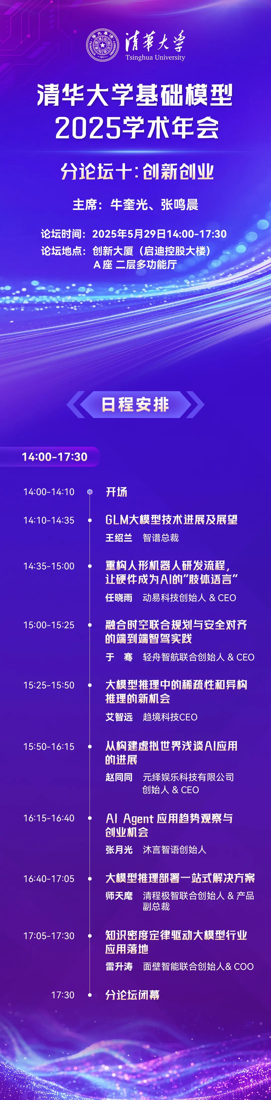 在全球新一轮科技革命和产业变革的浪潮中,人工智能(AI)作为引领未来发展的关键技术,正以前所未有的速度深刻影响着各行各业。为探索AI技术的前沿趋势、促进产学研用深度融合,推动创新驱动与创业生态的协同发展,本次 “人工智能创新创业论坛” 特邀技术创新领先企业的技术领袖和创业先锋,围绕基础模型、具身智能、智能驾驶、AI技术创新、产业落地等核心议题展开深入探讨。本论坛致力于打造一个思想交流的平台、成果转化的桥梁与人才合作的纽带。我们期待在这里碰撞出创意火花,链接优质资源,助力AI时代下的新一代创新创业者走得更远、更稳、更快。