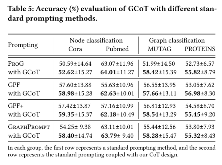 其次研究者们将CoT设计加入图提示学习的其它基准模型中(GPF,GPF+,ProG,GraphPrompt),并再次研究这些模型的性能,结果呈现在上表中。