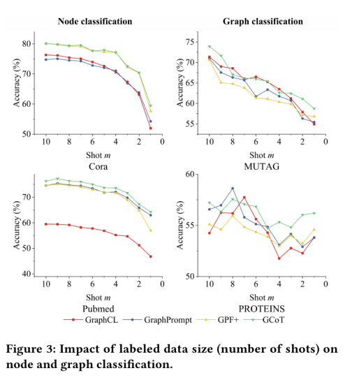 实验结果表明,GCoT在八个图数据集上的少样本节点分类与图分类任务全面超越现有SOTA方法,尤其在1-5样本的极少样本设置下表现最为显著。