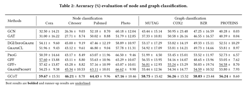 他们在八个图数据集上进行了广泛实验,涵盖节点分类与图分类两类任务,结果表明GCoT在少样本学习中相较现有SOTA方法具有显著优势。