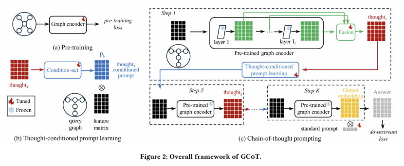 本文中研究者提出的GCoT是首次将思维链提示学习框架扩展到无文本图数据上的尝试,具体而言他们做了如下设计: