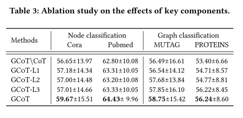 他们观察到对于所有的模型加入了CoT后效果都有提升,这进一步表明了他们设计的GCoT可以广泛适用于各种图提示学习模型,并在节点分类与图分类上有通用性。