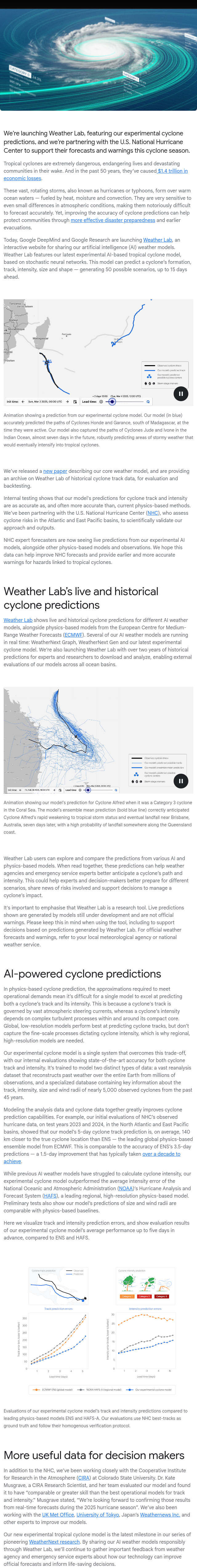 Google DeepMind和Google Research推出了Weather Lab,一个互动网站,用于分享其人工智能(AI)天气模型,并与美国国家飓风中心合作支持本季的飓风预报和警报。热带气旋(又称飓风或台风)极具破坏性,过去50年造成了1.4万亿美元的经济损失。这些风暴由温暖海洋水汽、热量和对流驱动,对大气条件变化极为敏感,因此预测难度极大。然而,更精确的预测能够通过提升防灾准备和提前疏散保护社区。Weather Lab展示了DeepMind在气旋预测上的最新实验成果,旨在通过AI技术改进天气预报,减少自然灾害带来的影响。