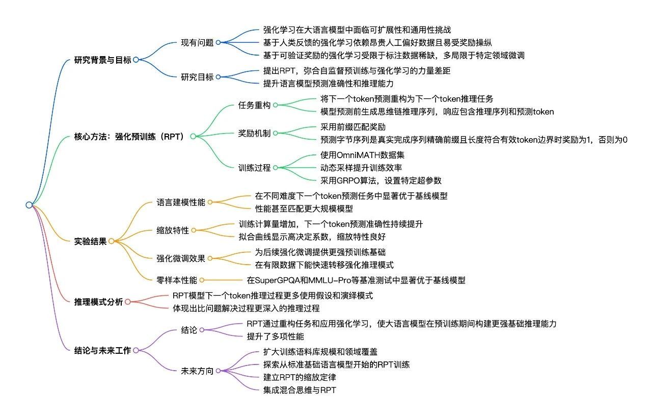 本研究提出了一种新的语言模型预训练方法——强化预训练(RPT),通过将下一个词预测任务转化为一个推理任务,并利用强化学习进行训练,以激励模型基于给定上下文正确预测下一个词。实验结果表明,RPT 不仅能显著提高语言模型的预测准确性,还为后续的 RL 微调提供了更强大的基础,从而在零样本迁移学习任务上提升了性能。