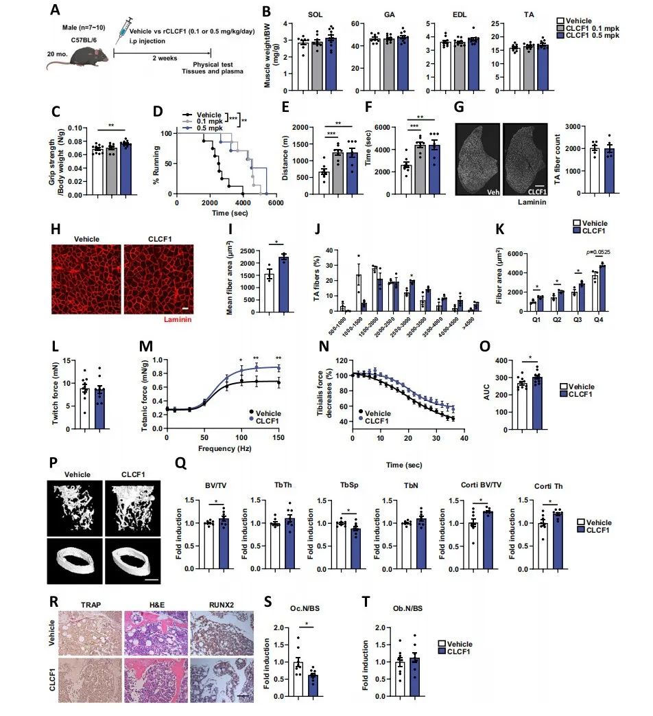 然后研究人员对老年小鼠进行CLCF1腹腔注射,CLCF1改善了小鼠的肌肉功能并抑制了骨质恶化,具体来说,对破骨细胞活性发挥了强效抑制作用,同时适度刺激成骨细胞功能,从而促进骨量增加。
