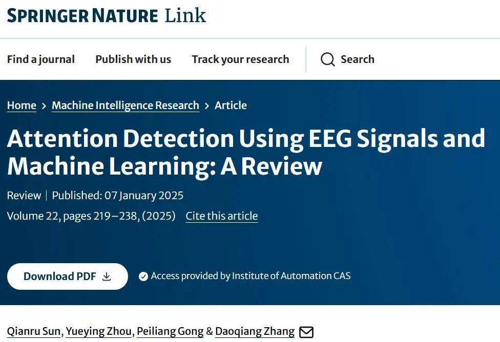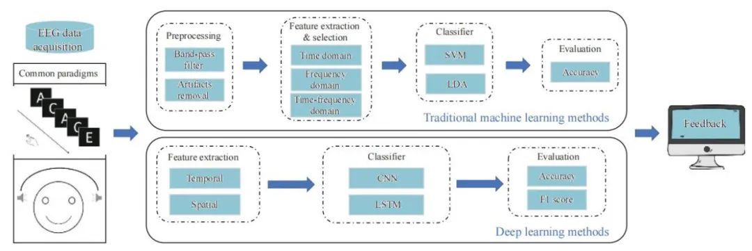 使用脑电图(EEG)信号进行注意力检测已成为研究热点。然而目前缺乏对EEG注意力检测中机器学习方法的系统性综述。南京航空航天大学张道强教授团队概述了过去五年中基于脑电图的注意力检测方面的最新进展,并重点关注听觉注意检测(AAD)和注意力水平分类。首先,文章简要概述了其常用范式、预处理技术与伪迹处理方法,并整理了过往研究中公开可用的数据集。其次,将当前主流的机器学习分类方法归纳为传统机器学习与深度学习两大类别,深入分析了各类方法的使用频率,并探讨了影响算法性能与应用场景的关键因素。最后,文章讨论了该领域现有的挑战和未来趋势。