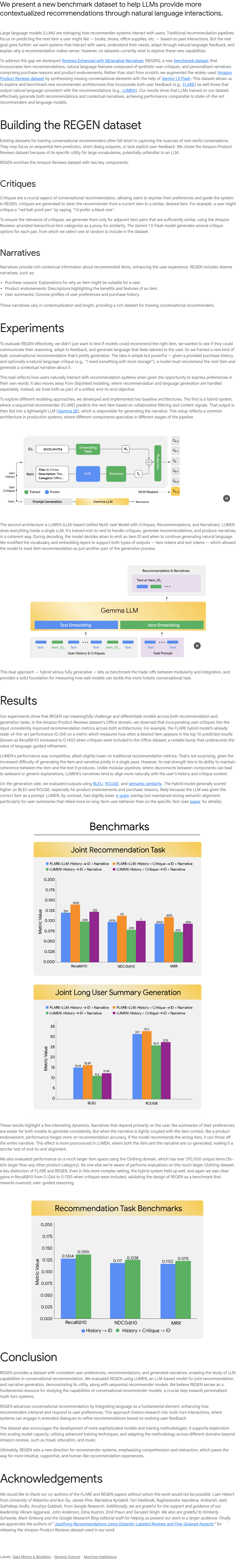 本文介绍了REGEN数据集,旨在通过自然语言交互提升推荐系统的上下文理解能力。当前推荐系统主要依赖用户历史行为预测喜好,而缺乏与用户互动、理解需求及解释推荐理由的能力。REGEN基于亚马逊评论数据构建,包含物品推荐、合成用户评论及个性化购买理由和产品推荐语。该数据集支持研究推荐系统在自然语言交互中的新功能,如反馈适应与推荐解释,填补了现有数据集的空白。