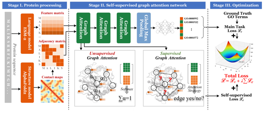 在技术方法创新方面,针对蛋白质结构信息挖掘不充分的问题,我们团队提出了一种基于自监督图注意力的蛋白功能预测方法,通过编码蛋白质分子内残基关联信息,充分利用残基间距离信息作为辅助任务,实现蛋白功能预测性能提升。