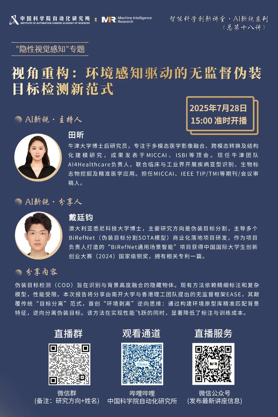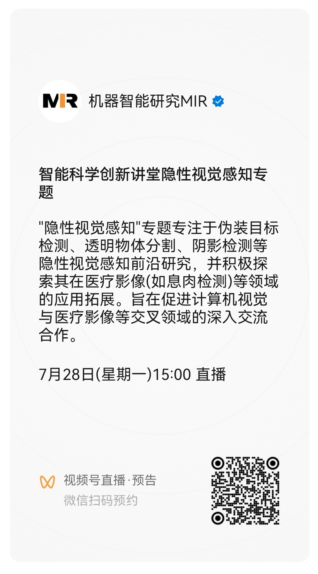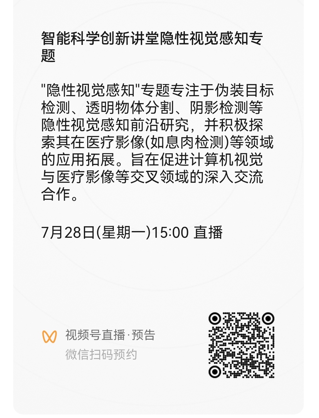 智能科学创新讲堂本期聚焦"隐性视觉感知"专题。"隐性视觉感知"专题专注于伪装目标检测、透明物体分割、阴影检测等隐性视觉感知前沿研究,并积极探索其在医疗影像(如息肉检测)等领域的应用拓展。旨在让这个重要而富有挑战性的研究主题更加活跃,通过开放的学术交流不断迸发新的思想火花,推动学术社区繁荣和领域持续进步,促进计算机视觉与医疗影像等交叉领域的深入交流与合作,逐步打通不同应用场景的技术壁垒。