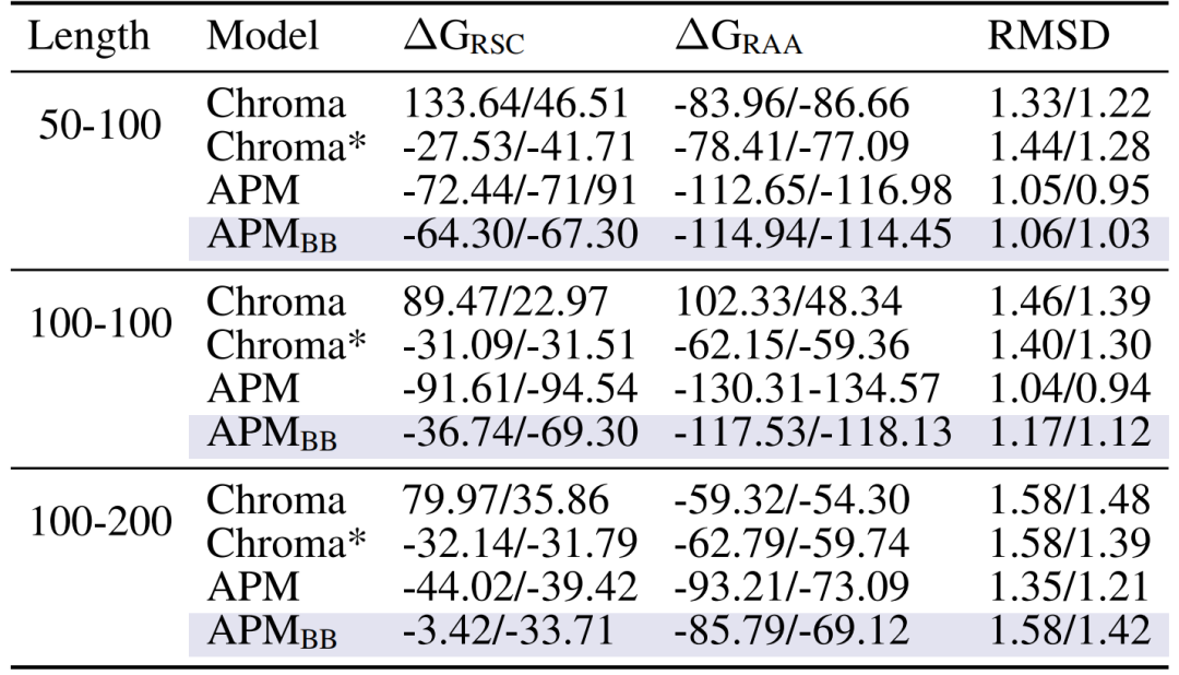 其次,生成的多链复合物具有强结合亲和力,以 50-100 链长为例,全原子松弛后的结合能 ΔG_RAA 达 -112.65/-116.98,显著优于 Chroma(-83.96/-86.66)和仅用主链的 APM_BB(-114.94/-114.45),证明全原子信息对链间作用建模的必要性。