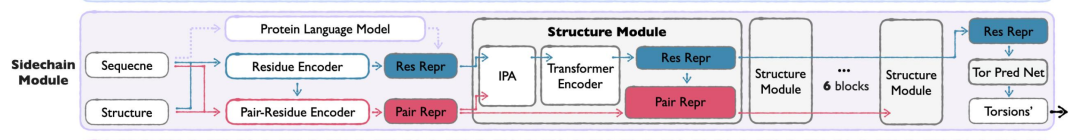 为实现全原子结构生成,Sidechain Module 基于 Seq&BB 生成的序列与 backbone,预测氨基酸侧链的构象。