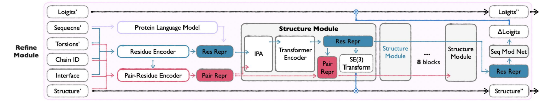 Refine Module 作为 APM 的最后一环,整合 Seq&BB 和 Sidechain Module 的输出,通过校正损失优化序列与 backbone,减少原子冲突并提升结构合理性。利用全原子信息优化序列和主链结构,解决结构冲突,使生成结果更接近天然蛋白质。该模块仅在生成后期(t≥0.8)激活,确保输入质量足以支撑优化。